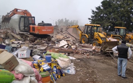 भूमाफिया महेश यादव और विनेश यादव का ढाबा एवं दुकानें जमींदोज