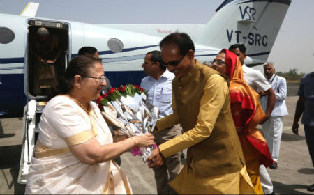 मुख्यमंत्री श्री शिवराजसिंह चौहान ने आज राजकीय विमानतल पर सपत्नीक लोकसभा अध्यक्ष श्रीमती सुमित्रा महाजन की अगवानी की।
