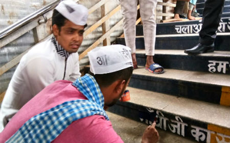 आम आदमी पार्टी ने राष्ट्रपिता महात्मा गांधी के अपमान के खिलाफ मोर्चा खोलते हुए गुरुवार को रेलवे स्टेशन पर विशेष अभियान चलाया जिसमें स्वच्छ भारत अभियान में स्टेशन की सीढ़ियों पर पैरों में आने वाले स्थानों पर लिखे गए गांधी के नामों को मिटाया।