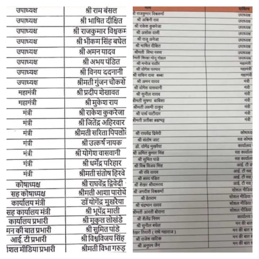 भाजपा के भोपाल जिला अध्यक्ष रविंद यति फरवरी महीने में घोषित अपनी जिला कार्यकारिणी के 37 पदाधिकारियों में से केवल नौ नेताओं को ही फाइनल सूची में स्थान दिला सके हैं। इनमें उपाध्यक्ष में राजकुमार विश्वकर्मा व भाषित दीक्षित तो मंत्री में योगेश वासवानी, कोषाध्यक्ष राघवेंद्र द्विवेदी, कार्यालय मंत्री डॉ. योगेंद्र मुखरैया, आईटी प्रभारी विश्वविजय सिंह शामिल हैं। राकेश कुकरेजा जिन्हें यति ने उपाध्यक्ष बनाया था वे अंतिम घोषित कार्यकारिणी में मंत्रीी तो विभा गरूण सोशल मीडिया प्रभारी, सह कार्यालय मंत्री सुमित पांडे मन की बात प्रभारी बनाए गए हैं। शेष अन्य 26 को नई घोषित कार्यकारिणी में जगह नहीं दी गई है।